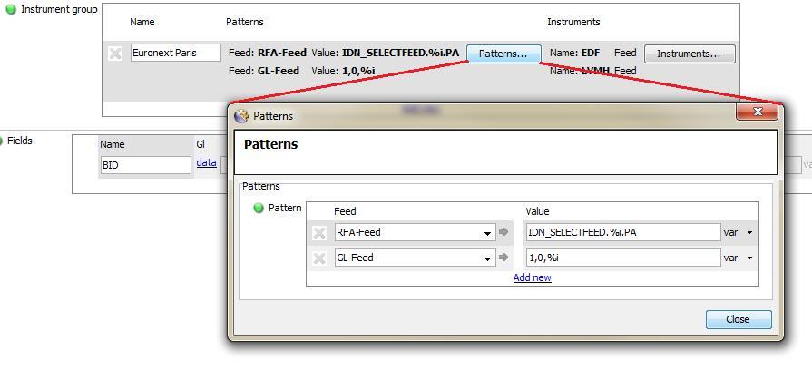 You can then configure the list of instruments for the instrument group by name. Each name will be configured for each feed by expanding the defined pattern. Occasional special cases can be overridden by defining a feed-specific code for a particular instrument, in the same way as for an individually configured instrument. An instrument may also exclude a feed for which a pattern has been defined, by overriding the code for the feed to be an empty string.