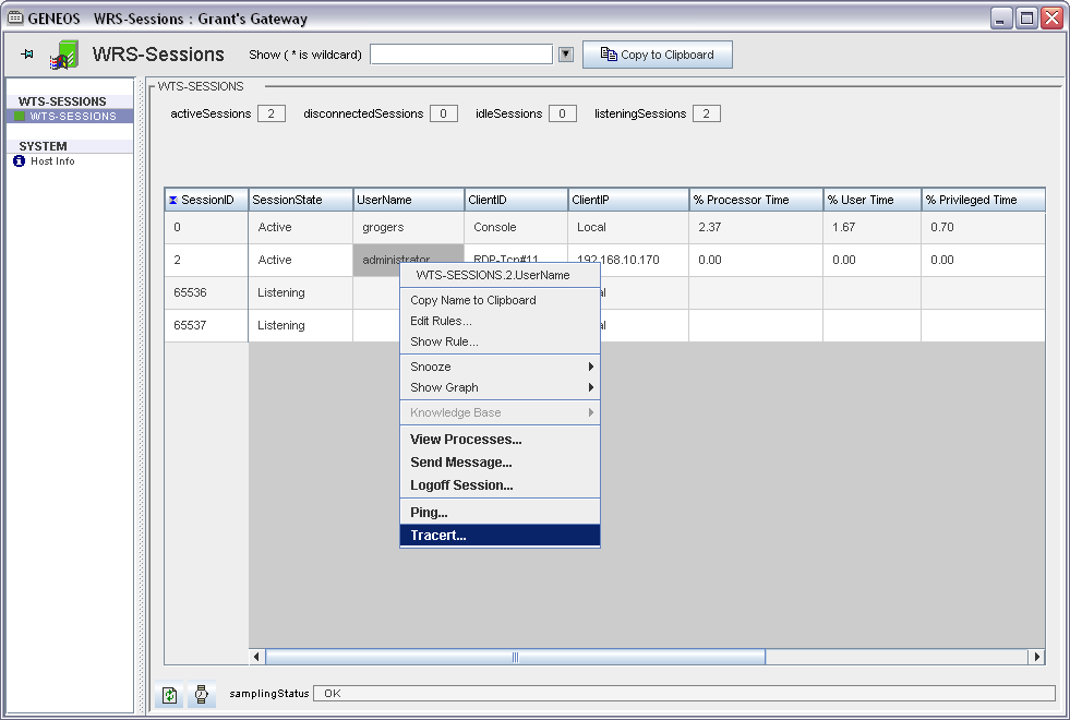 When selected traces the route to a client logged on to the terminal server. Right click their name and select traceroute.