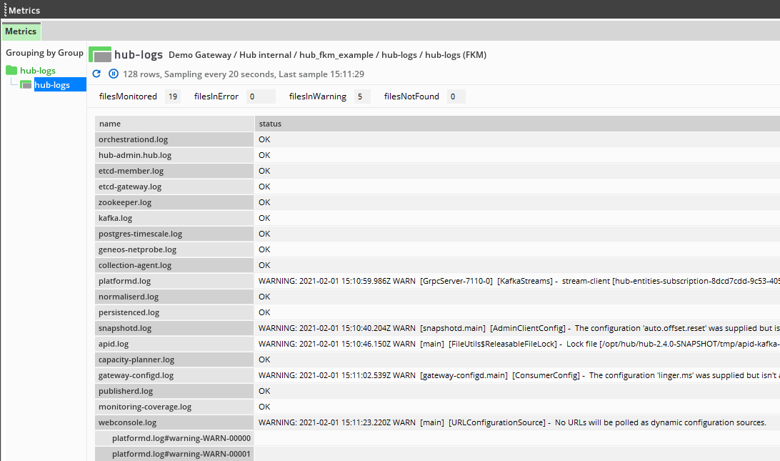 You can additionally monitor Gateway Hub log files using the FKM plugin. To do this you must configure a new Managed Entity using the hub-logs sampler provided as part of the geneos-integration-gateway-hub-<version>.xml include file.