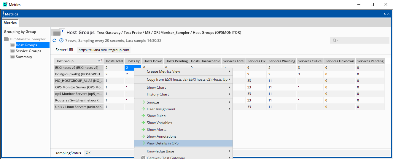 For example, if you right-click the cell for the Hosts Up and ESXi hosts v2 (ESXi hosts v2) host group in the dataview, then the OP5 Monitor List View page, which lists all the hosts that are up in the