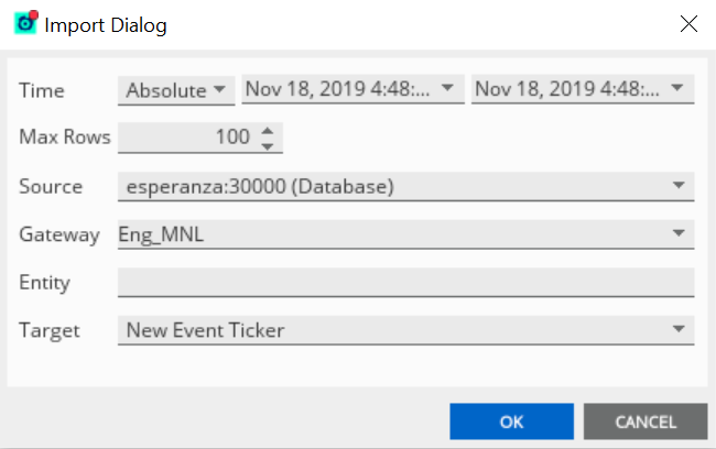 Imports events through a data source query. The Import Dialog screen is prompted that allows you to specify the time span to consider, from where the historical events is imported, the maximum number of results to return and whether the query must be additionally constrained by considering the path of the component which raised the event or not. |